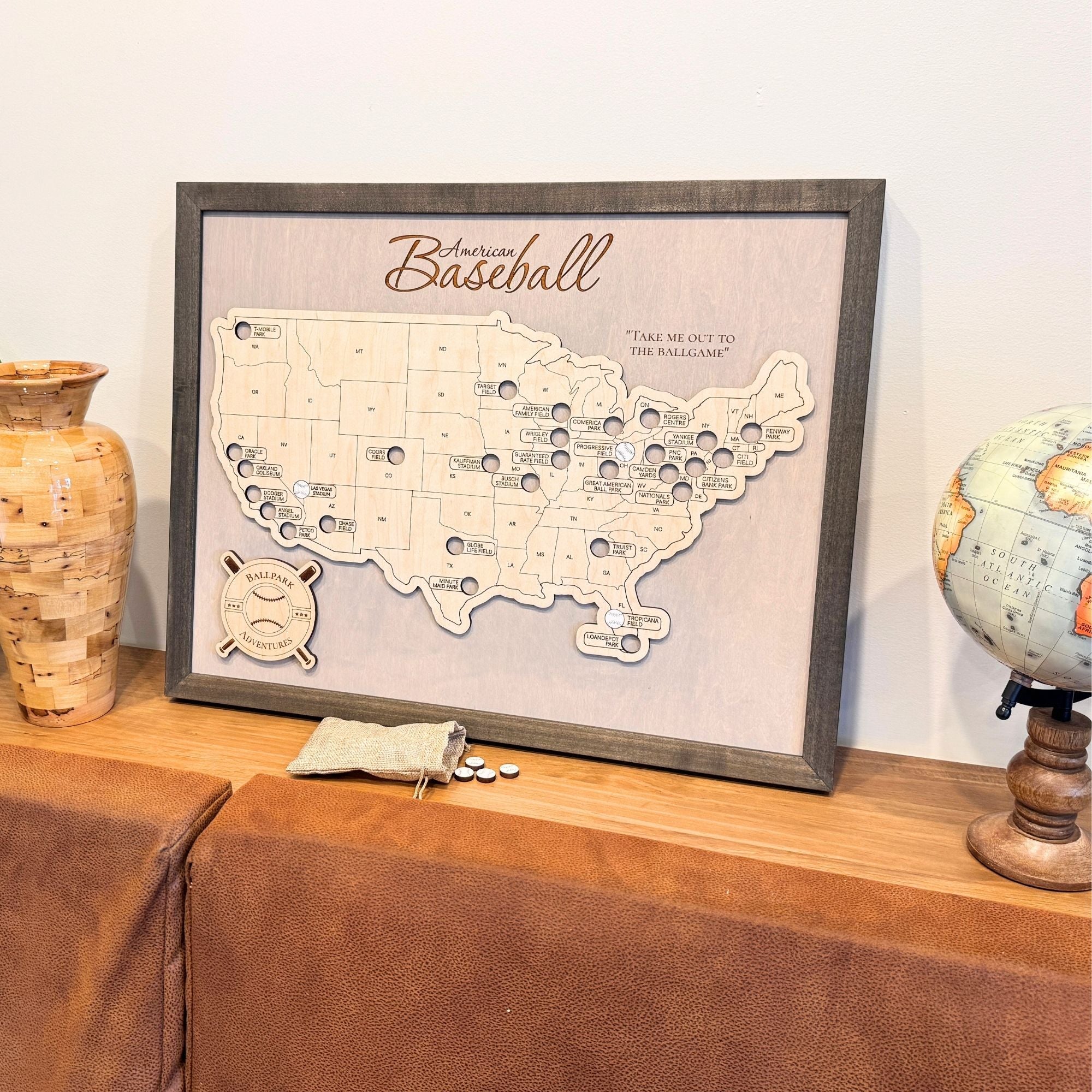 Track your travels as you visit all 30 U.S. major league stadiums. Display your wooden MLB travel map in your home, RV, or travel van.