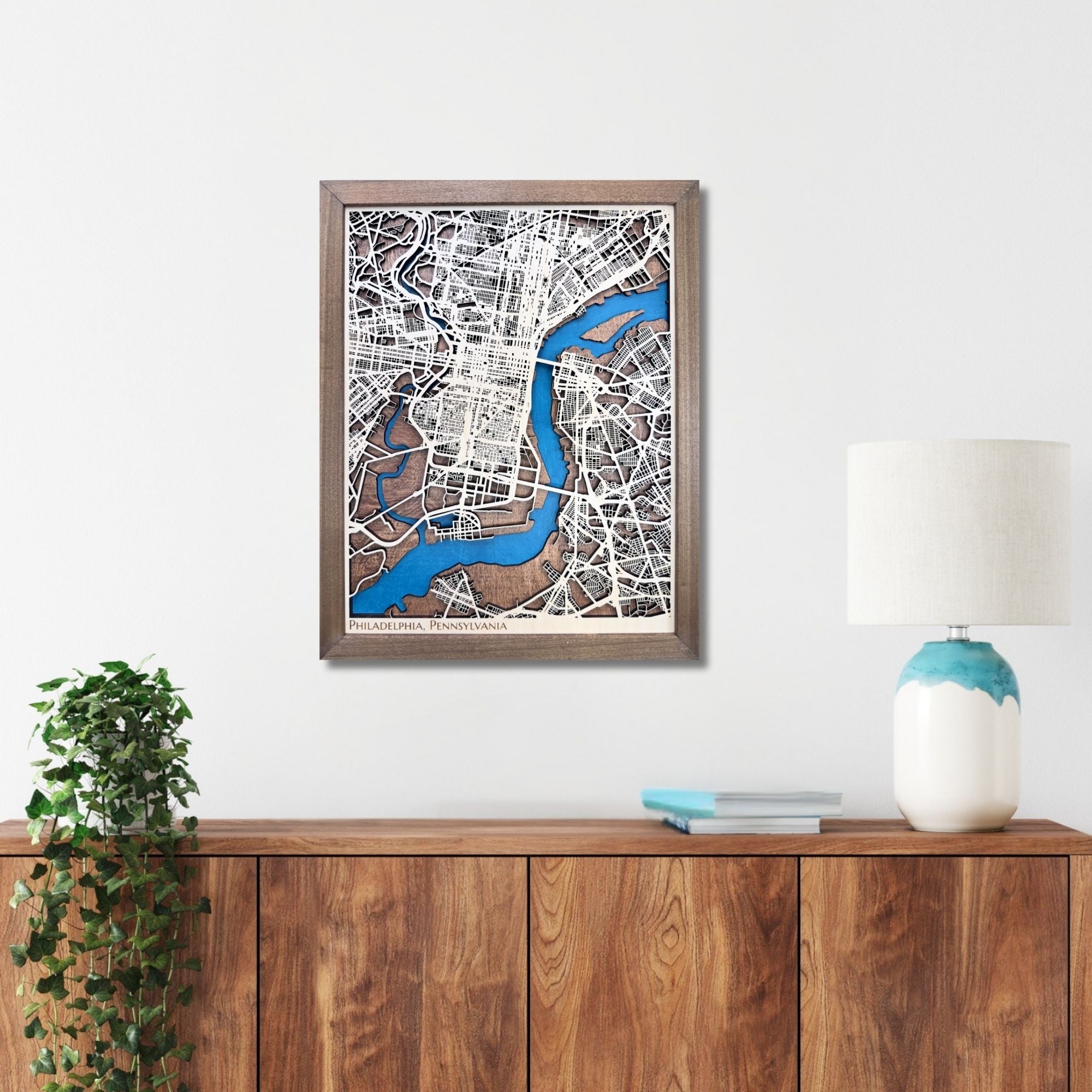 Our wooden maps are finished with a polyurethane protective coating. You only need to wipe your map with a clean, dry cloth to remove dust buildup. While the polyurethane coating protects the wood against water damage, we do not recommend hanging your map outdoors. Prolonged exposure to the elements may damage the map.